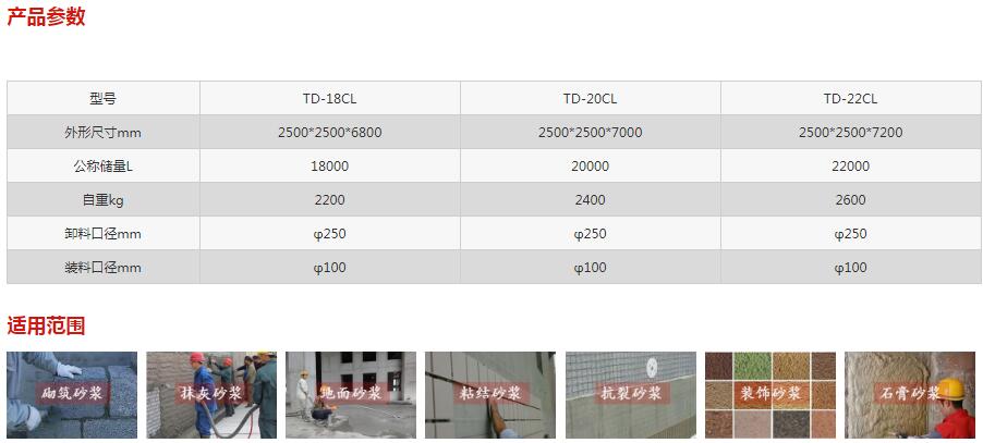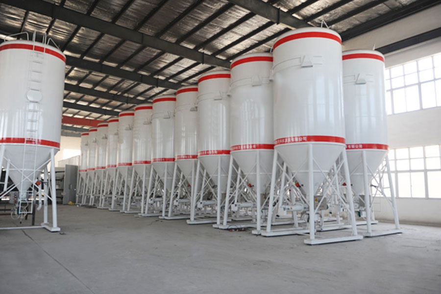 散装干混砂浆储存的载体,砂浆通过砂浆运输车运输至目的地,并通过气力输送至罐体内,占地面积小,全密闭,无粉尘,特有的防离析装置保证了输送过程中砂浆品质的保证。