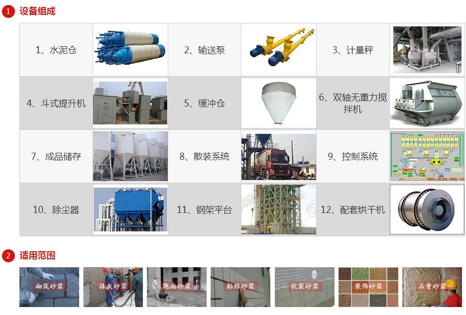 年产10万吨干混砂浆生产设备,按照生产流程自上而下布置;能耗相对低;占地面积小;原料交叉污染小;外观大气,适用于普通砂浆和部分特种砂浆生产。
