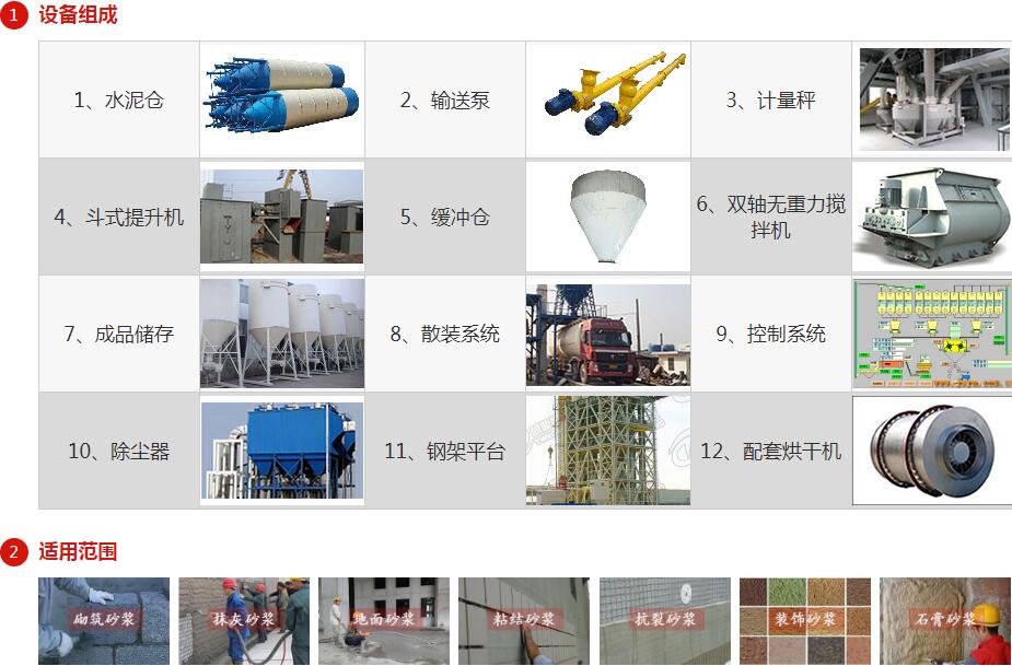 干混砂浆站是用于生产干混商品砂浆的生产线,主要组成模块一般包括以下部分: