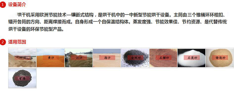 生产的系列烘干机广泛应用在:氧化铁皮、污泥、焦炭、生铁屑、铜精矿、碳化硅粉、稀土矿、汞矿粉、锡矿粉、钴矿粉、镍矿粉、锰矿粉、石膏粉、膨润土、高岭土、精铁矿、铅精粉、石油焦、金矿粉、钢渣、水渣、萤石矿、海沙、河沙等物料的烘干。