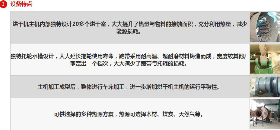 该机主要由回转体、扬料板、传动装置、支撑装置及密封圈等部件组成。我厂烘干机采用扬料板装置,具有导向、均流、扬料等多项功能,能使物料在烘干机径向截面均布,料幕成为薄、均、全的状态,完全接触热气流,达到充分利用热能的目的。我厂烘干机选用合理的运行参数,煤耗量和电耗量一般烘干机降低10-15%以上,台时产量提高10-15%以上,已在水泥和选矿企业的到了广泛的应用。