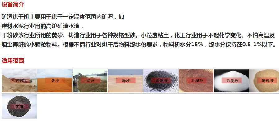制作精良、性能稳定、用煤量少、性价比高,该设备广泛运用于烘干黄沙、河沙、石英砂、矿渣、粘土等原材料。非常适合广大客户投资发展。
